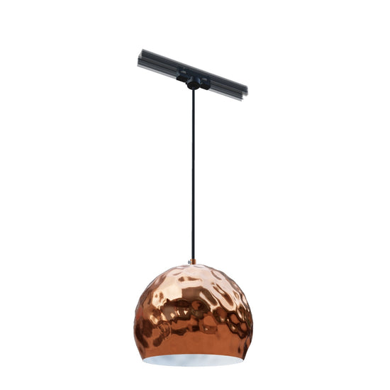Corp de iluminat agăţat cu abajur din metal strivit. Partea exterioară este din cupru iar interiorul este lăcuit alb. PVC cablu este terminat cu adaptor pentru șină cu 3-circuite.