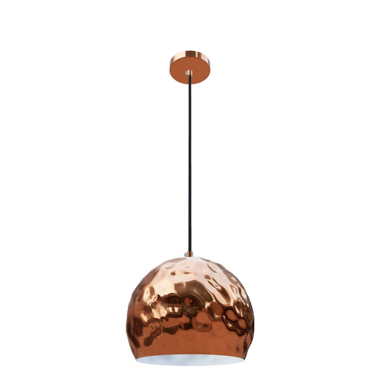 Corp de iluminat suspendat din metal cu efect lovitură de ciocan. Exteriorul abajurului este din cupru, interiorul este vopsit în alb. Inclusiv cablul din PVC negru și capacul de tavan din cupru.