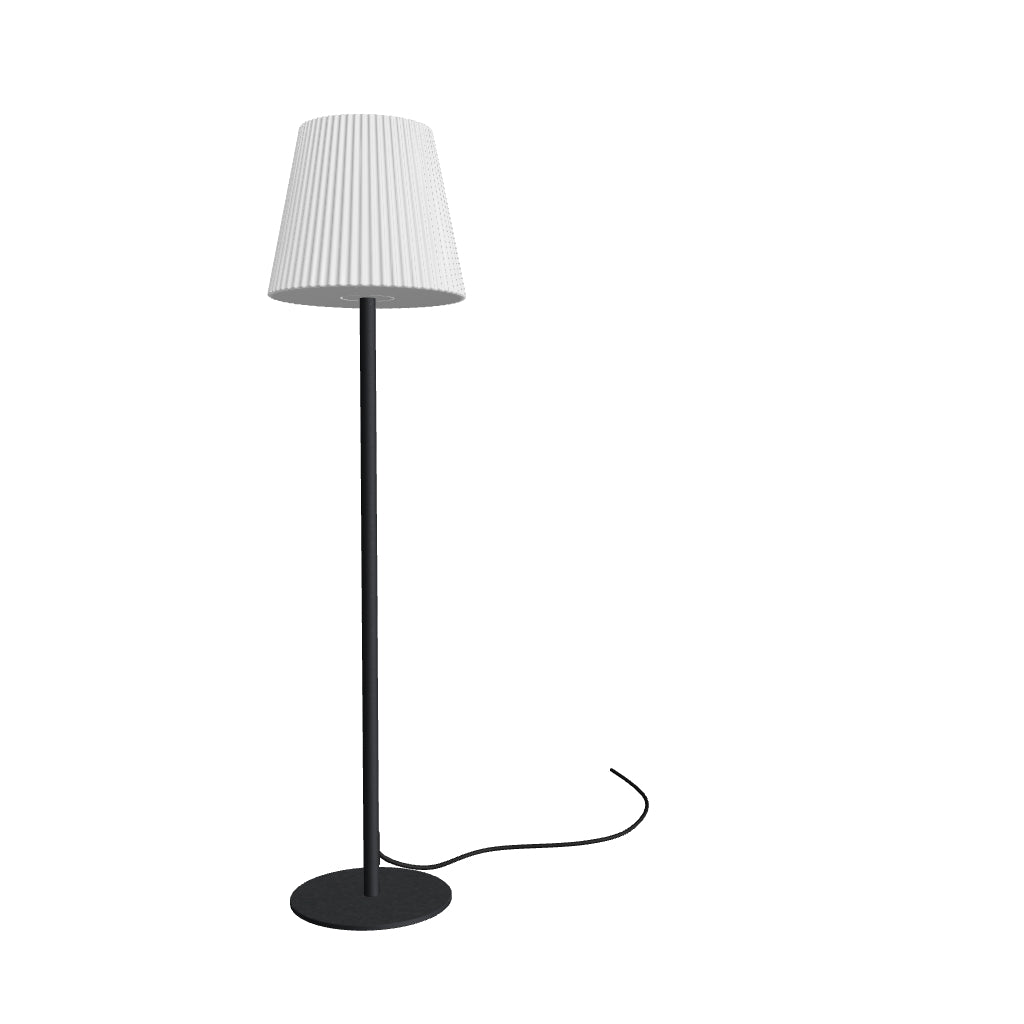 Lampă de podea cu abajur din plastic. Cablul de alimentare este terminat cu un conector de siguranță.