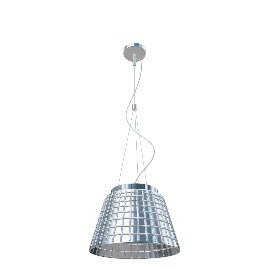 Corp de iluminat suspendat din sticlă structurată solidă. Sticla este cromată pe ambele părți. Când se aprinde, sursa de lumină este parțial vizibilă.