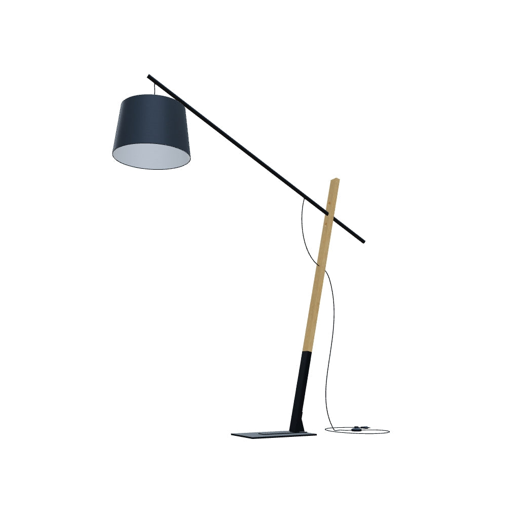 Lampă decorativă masivă pentru interioare spațioase. Baza este o combinație de lemn și metal, în timp ce nuanța este textilă.