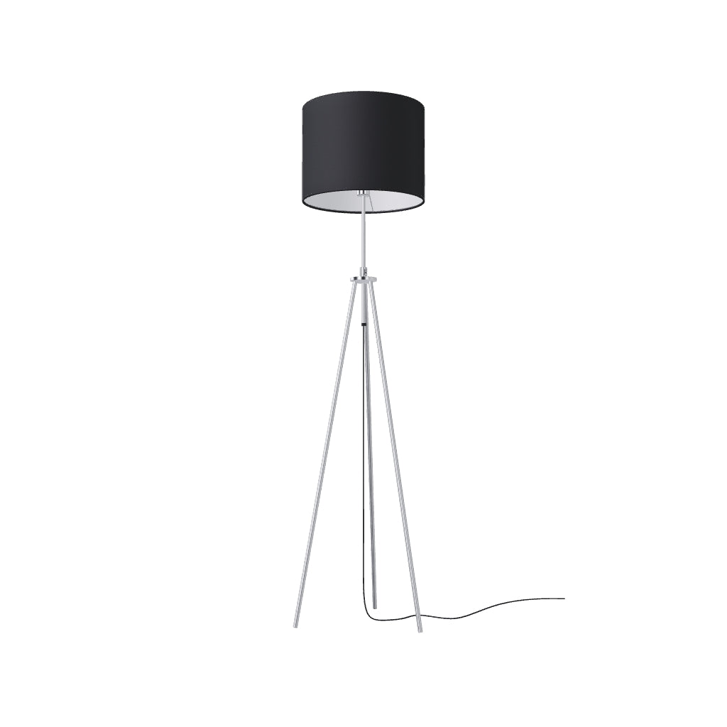 Lampă de podea pe trepied cu posibilitatea de reglare a înălțimi și abajur textil pentru bec cu soclu E27.