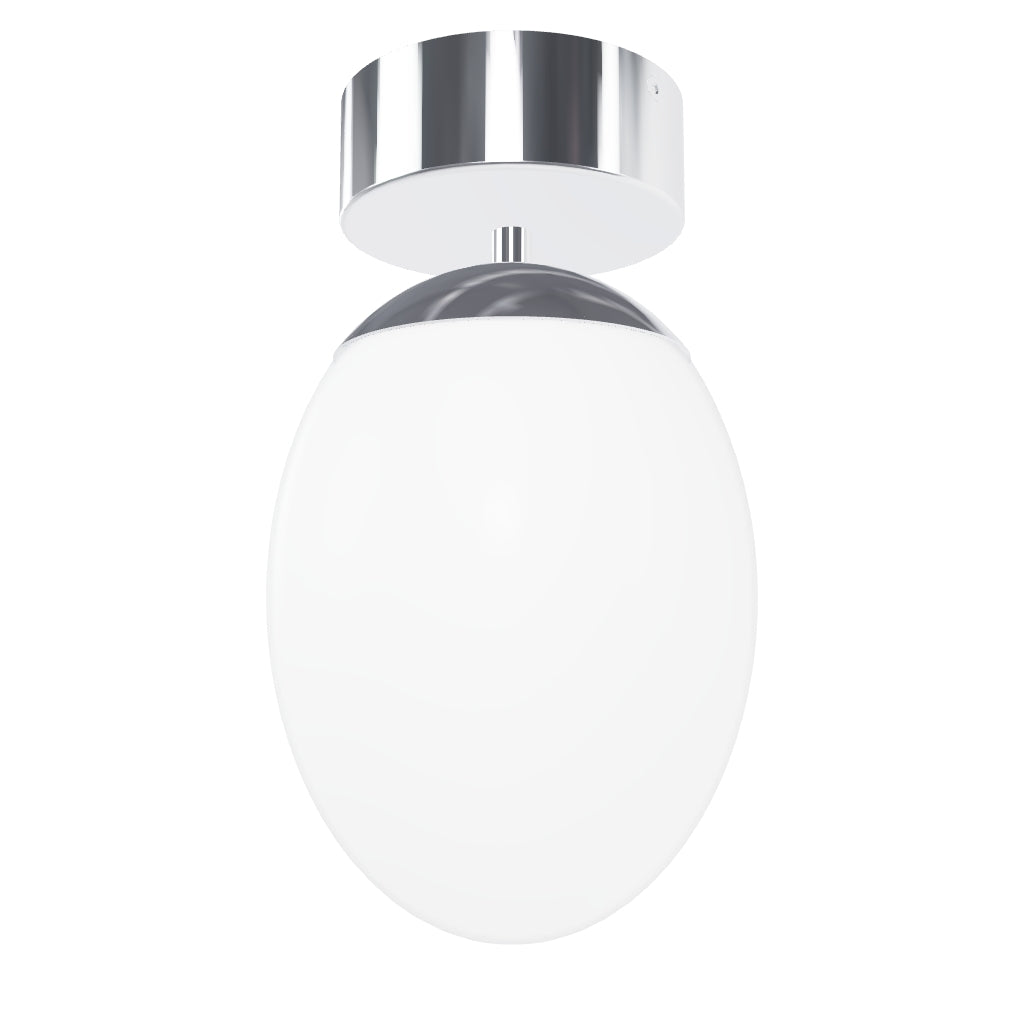 Plafoniera ovală din sticlă pe o bază cromată. Potrivit pentru băi.