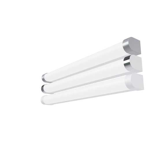 Lumină liniară pentru baie cu LED integrat potrivită deasupra oglinzilor, cu opțiunea de a achiziționa capace de capăt în diferite culori (R12906, R12907, R12908).