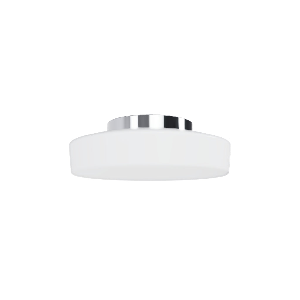 Plafoniera cu LED din sticla de culoare opal pe baza cromata. Potrivit pentru utilizare în băi.